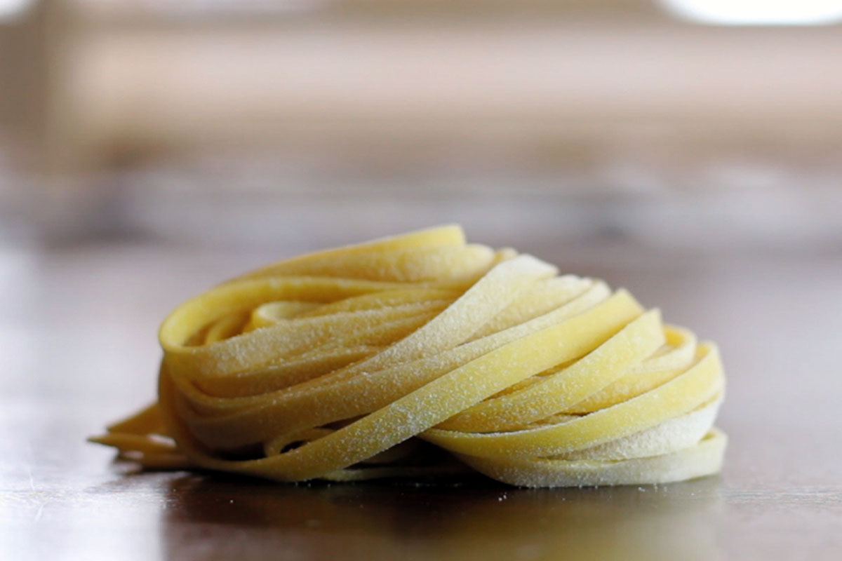 The first step is to flour your chitarra so that the pasta does not stick to anything when you’re rolling out your ribbons. Place a pasta sheet up on the strings. Add a bit more flour and begin rolling the fresh chitarra pasta out. As you apply pressure, the strings will to cut through your dough to form semi-thick ribbons of chitarra pasta.